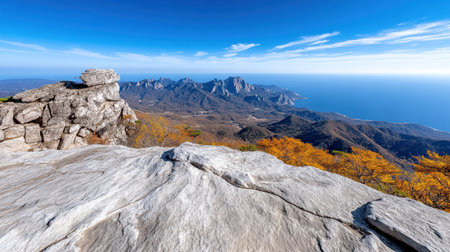 Colorful autumn hills and dramatic rock formations create a peaceful panoramic scene at Daedunsan Mountain