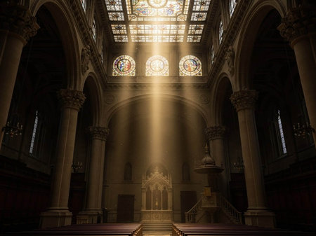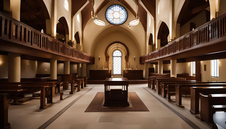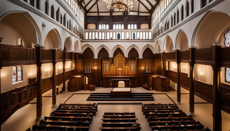 Majestic Church Interior with Magnificent Pipe Organ and Wooden Pews Concept of Spiritual Serenity, Architectural Grandeur, Sacred Spaces, and Historic Design.