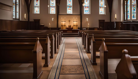 A view of the interior of a church, looking down the aisle towards the altar. The pews are empty, suggesting a quiet and peaceful atmosphere. Stained glass windows can be seen in the background, adding to the sense of spirituality.