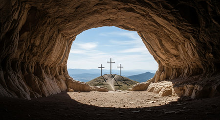 A scenic view of three crosses on a hill from a cave entrance.