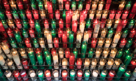 Rows of burning sacrificial candles in different colors