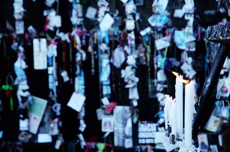 Close up of burning candles with gifts and papers in the background in Santiago de Chile Cerro San Cristobal, Chile South America