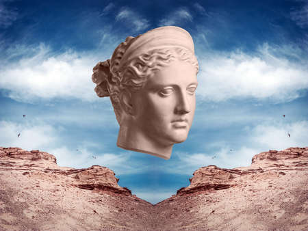 Surreal modern conceptual art poster with ancient statue face of Apollo and sky. Collage of contemporary art.