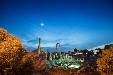 The ruins of the Apollo Palace in Sid, Turkey at twilight. Copy space.