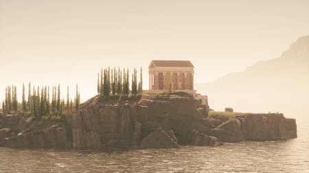 The remnants of a Roman temple rest majestically on a rocky outcrop, surrounded by cypress trees, as the warm glow of the golden hour reflects off the water, creating a serene atmosphere.