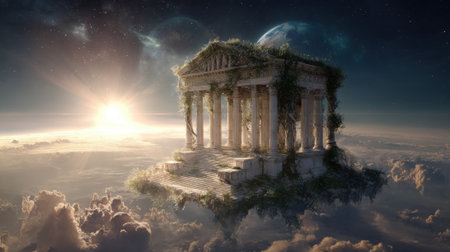 A grand temple rests atop a cloud, adorned with lush greenery. The vibrant sunset casts warm light, creating a magical atmosphere in the fantasy sky.