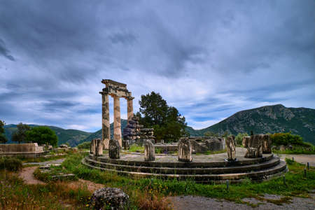 Ruins of Tholos of ancient Greek goddess Athena Pronaia in Delphi, Greece. Parts and restored Doric columns.