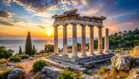 Experience the breathtaking beauty of an ancient ruin during sunset. This stunning landscape features serene waters, a distant island, and a peaceful atmosphere.