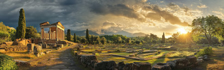 Majestic sunset illuminates ancient columns, casting long shadows on a rocky landscape. The scene embodies tranquility, history, and natural beauty.