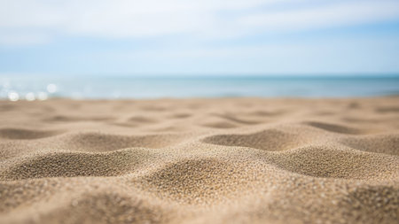 Fine grains of golden sand are scattered across a peaceful beach. The bright sun shines overhead, casting a warm glow, while soft waves roll in the distance.