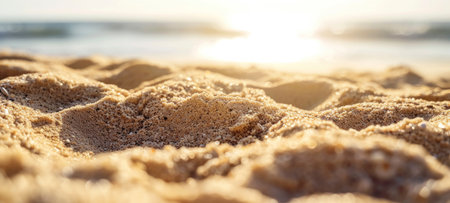Close-up of sandy beach with golden hues and sun glint. Macro shot, serene nature and relaxation concept, design for wallpaper, background.