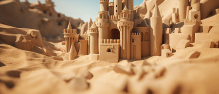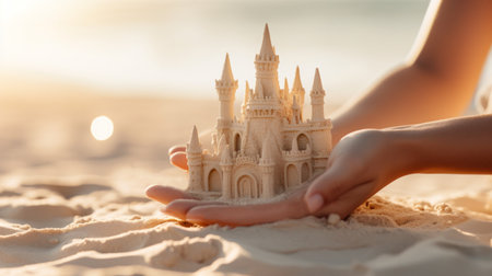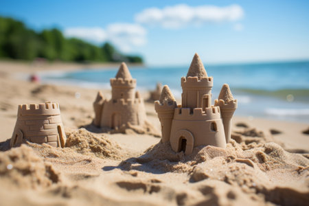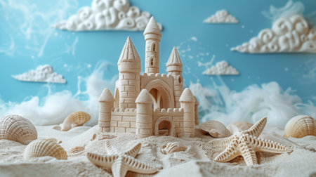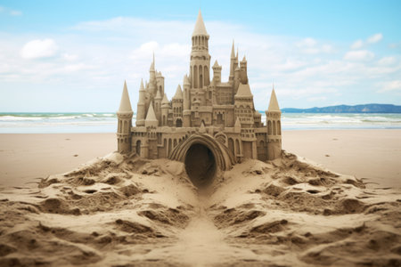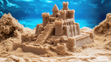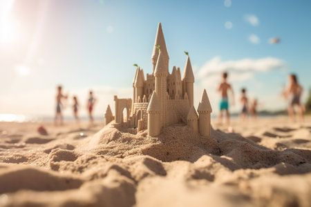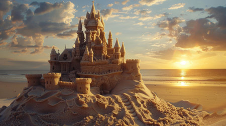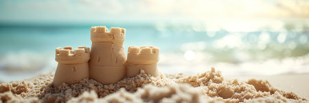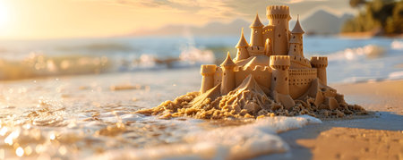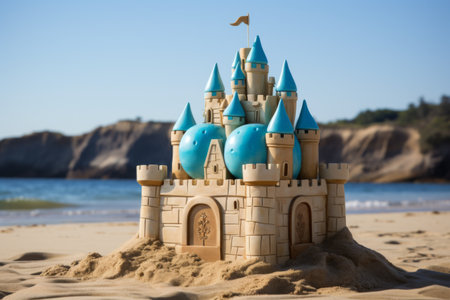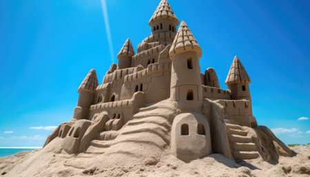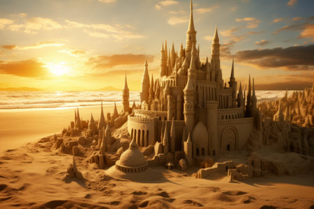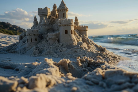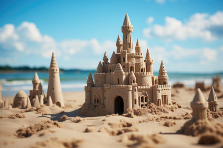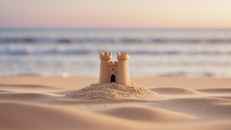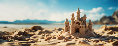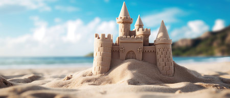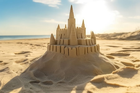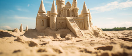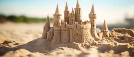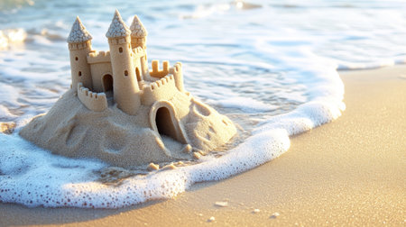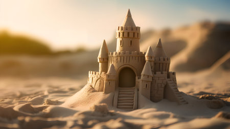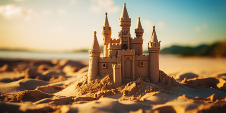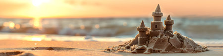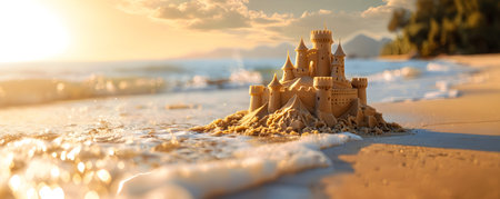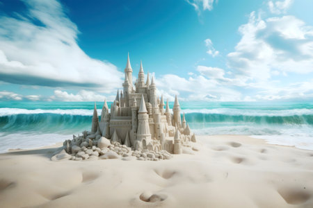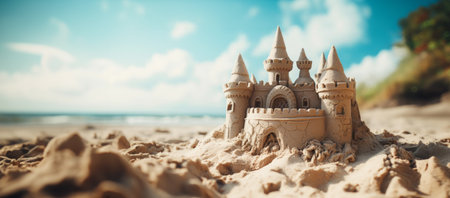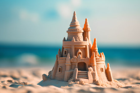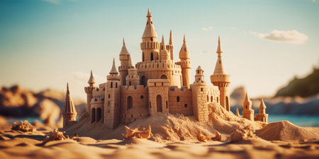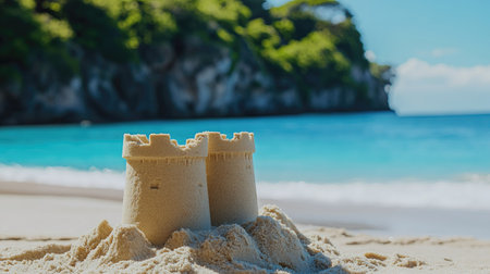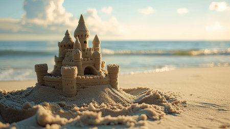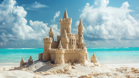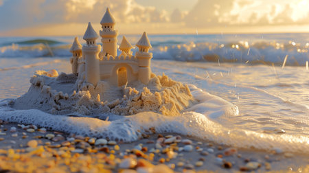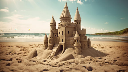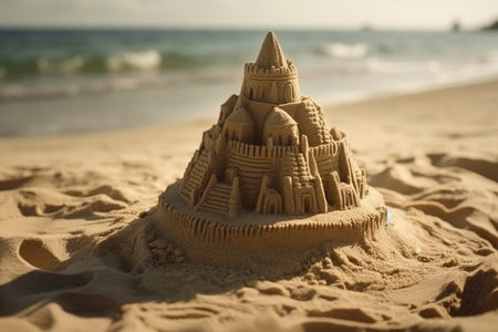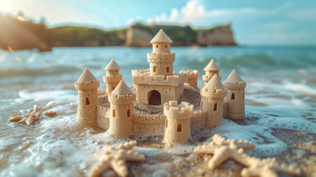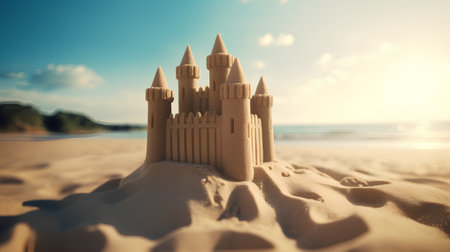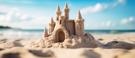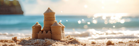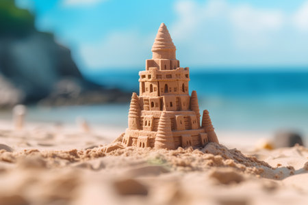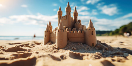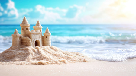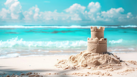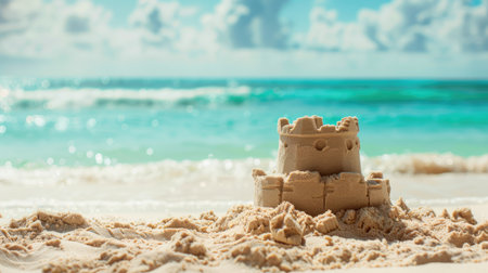 Scenic sandcastle on the beach, surrounded by golden sand and shimmering waves, evoking summer vacation vibes