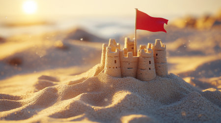 Sandcastle with red flag on beach at sunset, warm golden light, ocean waves in background. Childhood creativity and summer vacation concept