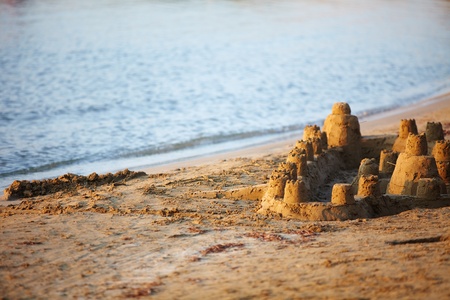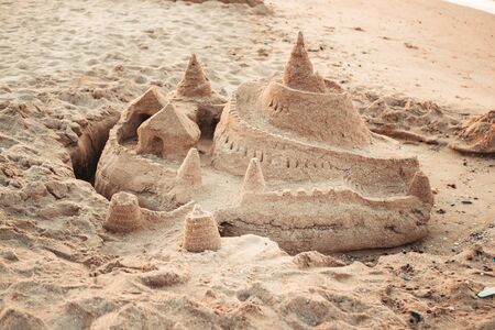 Sand castle on the beach at sunset. Holidays and travel concept