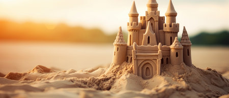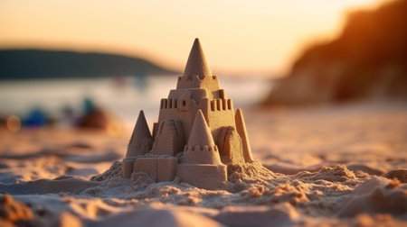 Sand castle on the sea coast shooter during sunset Summertime concept Copy space : Generative AI