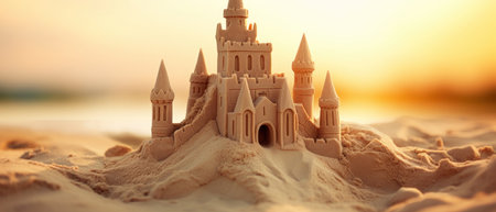 AI Generated. Sandcastle on Beach at Sunset with Soft Light and Waves in Background