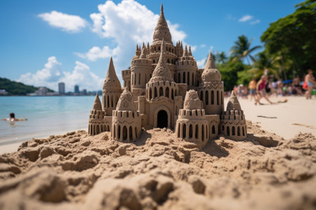 Detailed sandcastle on a sunny beach with blurred people in swimsuits, capturing the essence of summer leisure and creativity.