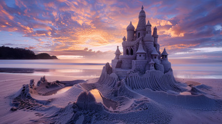 A stunning sandcastle adorned with seashells sits on the beach, bathed in the warm glow of sunrise, evoking a sense of peace and creativity in a coastal paradise.