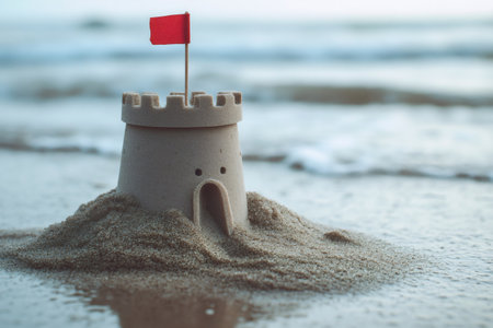 Sandcastle with a red flag standing on a sandy beach. Ocean waves are approaching its base, symbolizing impermanence and childhood joy