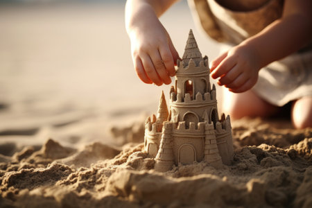 Close-up of hands and castle structure, child building a sand castle on the beach.