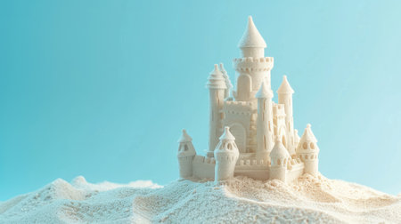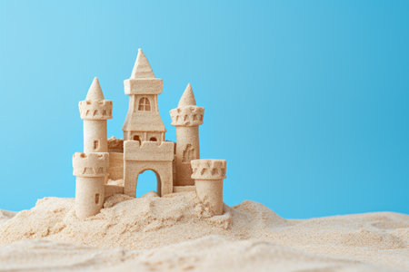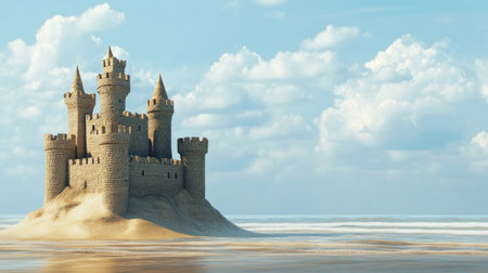 Sandcastle with detailed moat and towers, set against a serene, wide-open beach, copy space available