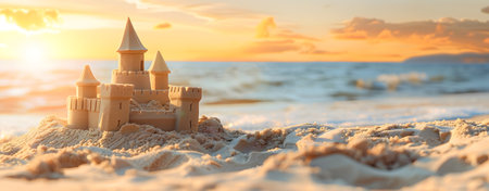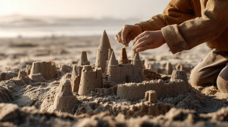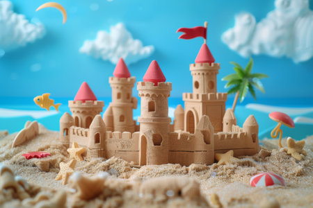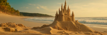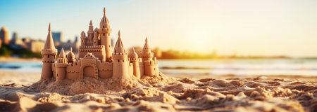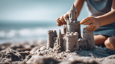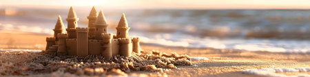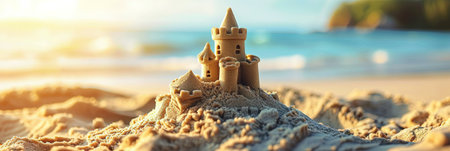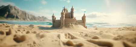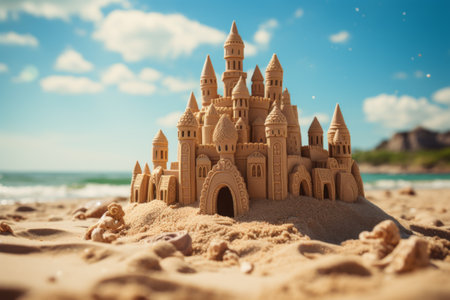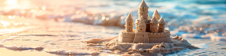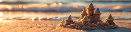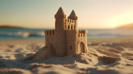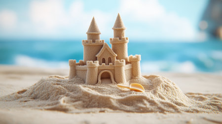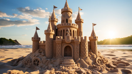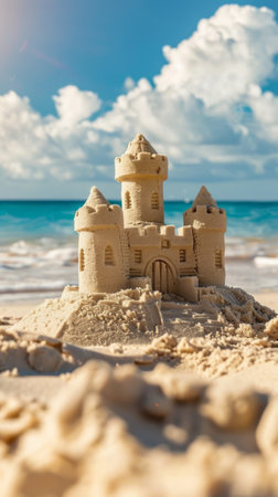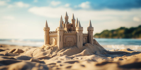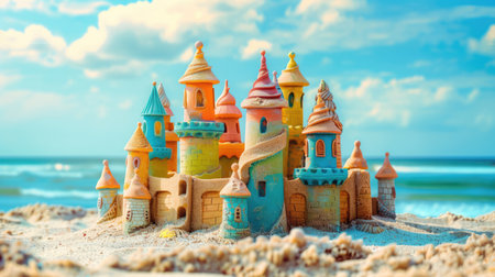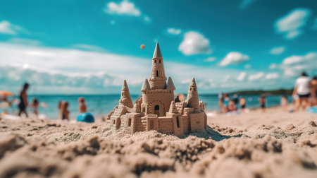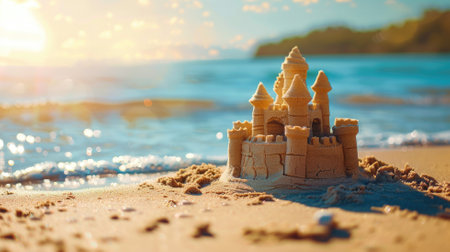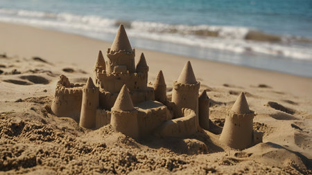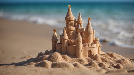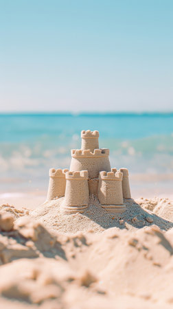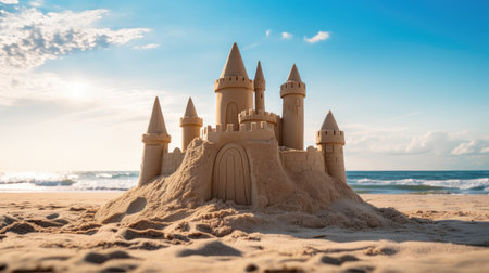 Intricate sandcastle towers and turrets rise majestically on the shore, showing childrens creativity. Perfect for beach day fun, inspiring imaginations to soar under the sun.