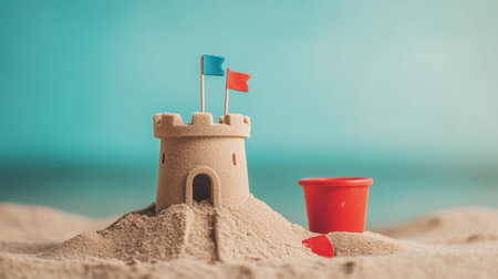 A vibrant sandcastle adorned with colorful flags sits on a beach, capturing the essence of summer joy and childhood creativity by the serene ocean waves.