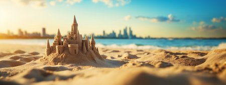 Grand intricate sandcastle on the beach during a summer day with a blurred city backdrop. Generative AI.