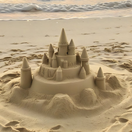 A magnificent sandcastle stands proudly on a sunny beach. Waves gently lap the shore in the background.