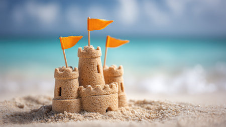 Small sandcastle sits on a beach, with small orange flags affixed to its towers. The background displays a tranquil ocean scene, blending turquoise water with a hazy sky. The focus is on the sandcastle, with the ocean and sky softly out of focus.