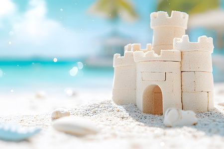 Sand castle on the beach with blue sea and white sand, summer vacation concept