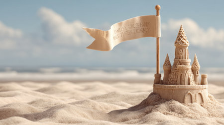 A beautifully crafted sand castle stands on a beach, complete with a unique flag fluttering in the breeze. A perfect symbol of summer creativity and fun.