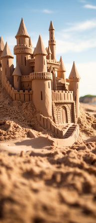 An elaborate sand castle stands proudly on the beach, highlighting artistic skill. The structure features towers, walls, and intricate designs, with beach sand spread around.