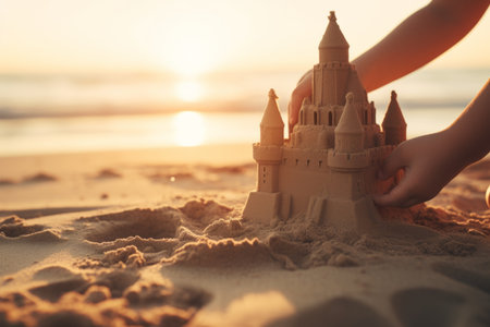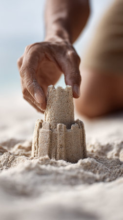Close up of a mans hand carefully placing the top of a sandcastle tower on a sunny beach, savoring the joy of a relaxing summer vacation by the ocean waves and warm sun