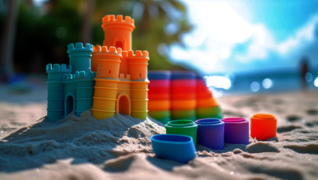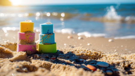Colorful sandcastles stand proudly on a sunlit beach, surrounded by shimmering waves and glistening sand, capturing the essence of summer joy.