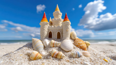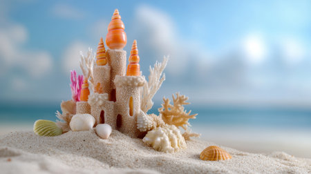 A fairytale-like castle made of vibrant shells and corals, nestled in sand under blue skies