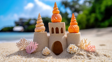 Whimsical underwater-style sandcastle with seashell towers and coral details by the shore
