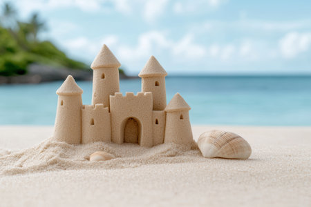 A beautiful sandcastle sits on a sunlit beach with gentle waves in the background. Ideal for summer themes, family activities, and joyful coastal experiences.