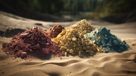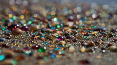 Colorful stones and gems are spread out on sandy beach, shining brightly under sunlight.