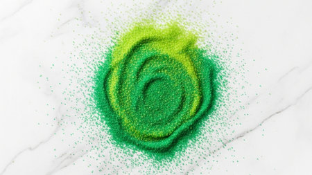 A mesmerizing spiral of vibrant, sparkling sand draws the eye inward.