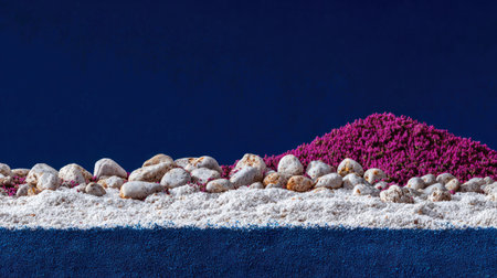Visually compelling still life composition featuring a horizontal arrangement of smooth, pale stones resting on a layer of white granular material, which separates a richly textured mound of bright purple material from a deep indigo or navy blue background and foreground border.