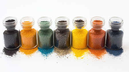 a row of jars containing different colored sands, created with generative ai