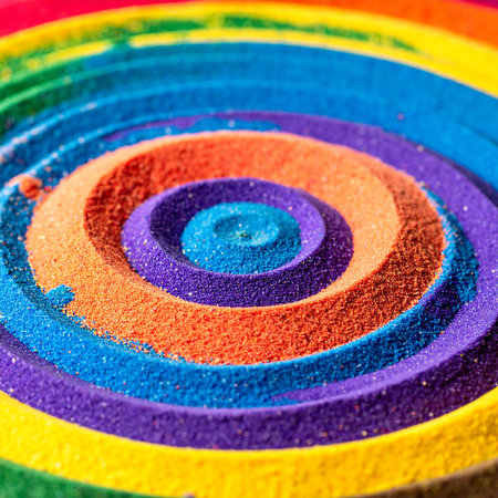 Vibrant rainbow sand patterns arranged in colorful stripes on a white surface
