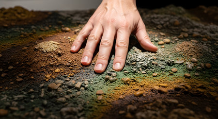 A person's hand gently touches a textured, contoured surface composed of various colorful soils, sands, and minerals. The different colors and textures represent geology, earth science, connection to nature, and sensory exploration.