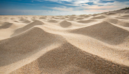The image captures the serene beauty of golden sand dunes, softly illuminated by the warm glow of sunlight. The gentle curves and sparkling grains create a tranquil atmosphere, inviting viewers to experience the peacefulness of nature.