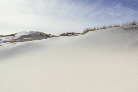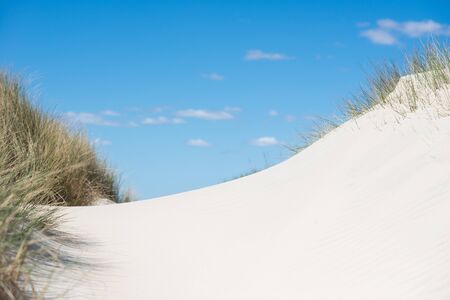Bright landscape of white sand dunes, dry grass on hillocks and sun in the sky at sea coast. Picturesque view from low angle, Amrum, Germany, Schleswig-Holstein
