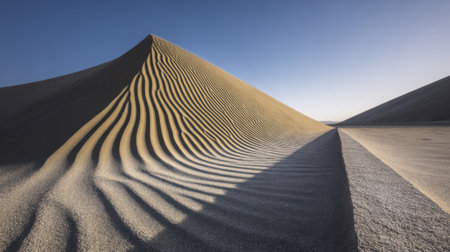 A stunning sand dune rises gracefully against a clear blue sky, showcasing the intricate textures and soft shadows of the desert landscape, evoking tranquility and beauty.