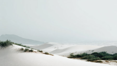 Capture the tranquility of soft white sand dunes under a muted sky. This serene landscape features gentle curves of sand with lush greenery, perfect for nature-themed projects.