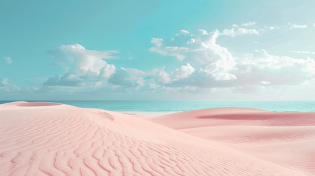A breathtaking view of pink sand dunes stretching toward a tranquil ocean under a bright sky filled with fluffy white clouds. This serene landscape captures the beauty of nature, providing a perfect backdrop for relaxation and peaceful reflection. Ideal for travel and nature enthusiasts.