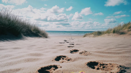 A serene scene capturing footprints leading across soft sandy shores towards a calm ocean, framed by gentle grasses and a vibrant sky with fluffy clouds.